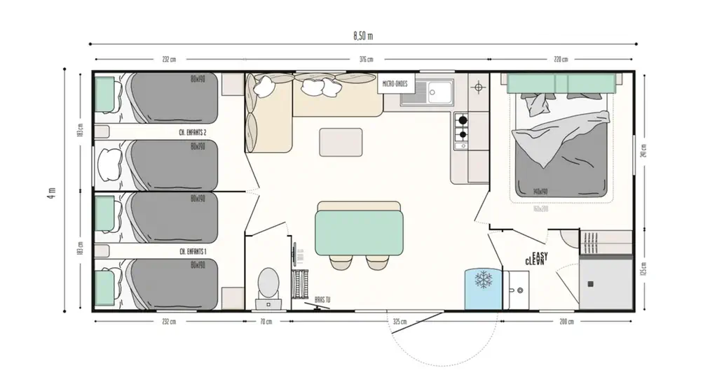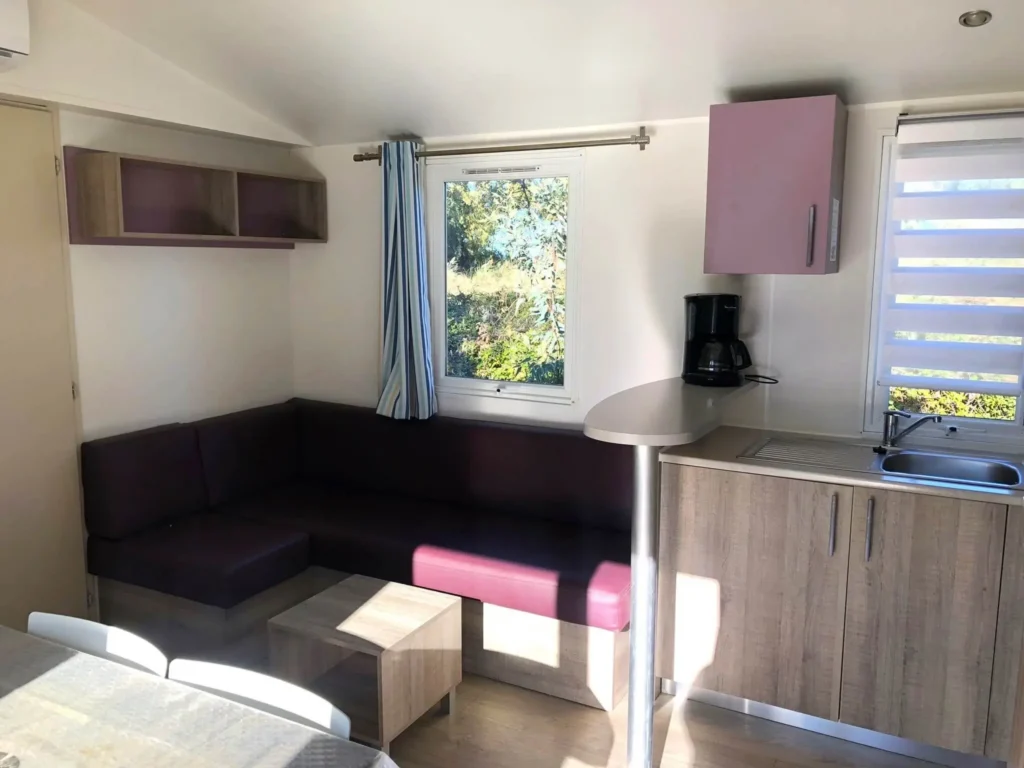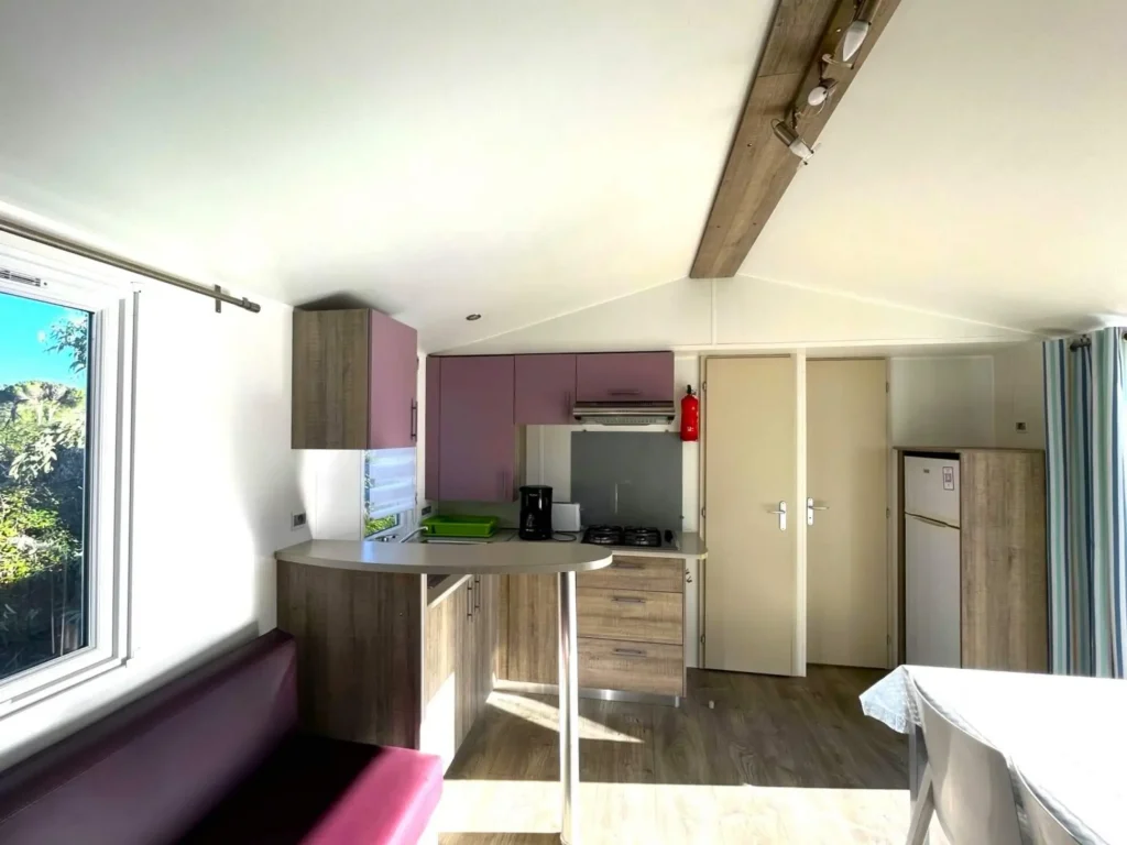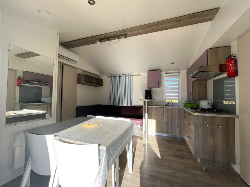 Entièrement équipé et climatisé, il offre une belle luminosité aussi bien à l’intérieur, grâce à son espace de vie avec salon et téléviseur ainsi que sa cuisine ouverte, qu’à l’extérieur avec sa charmante terrasse ombragée.