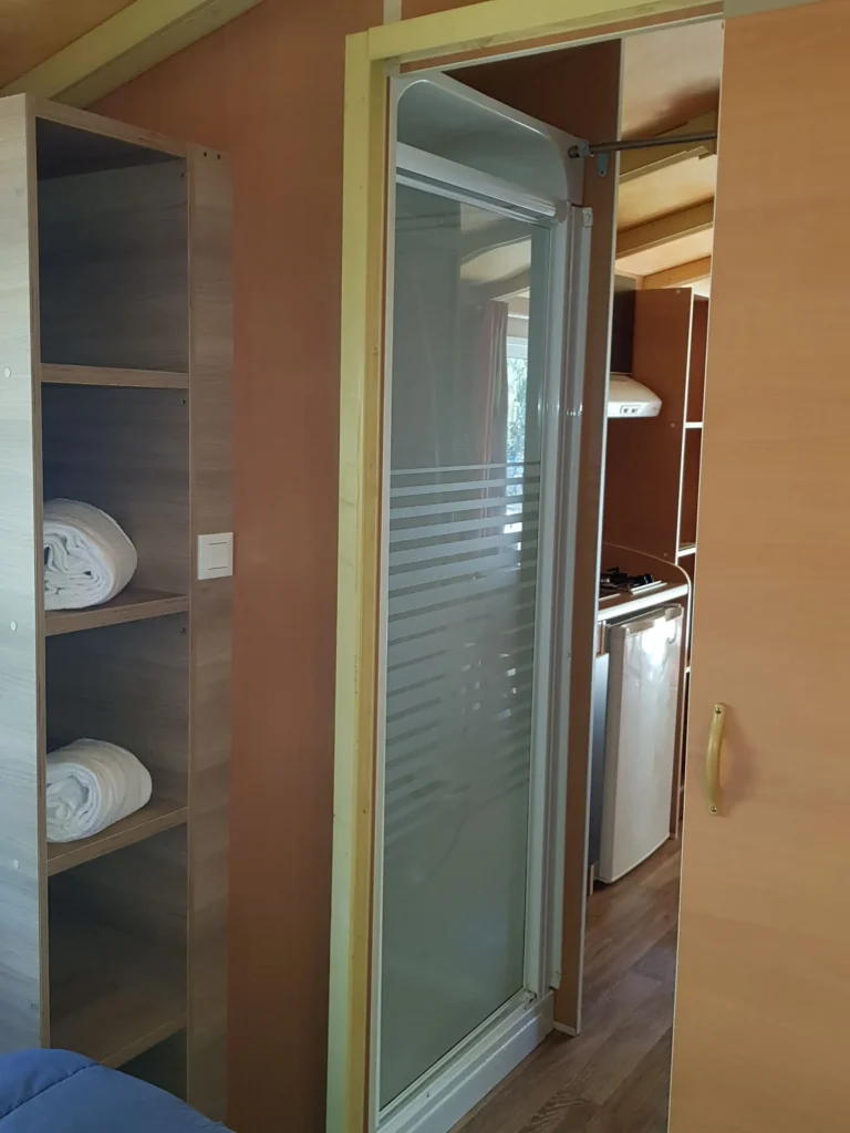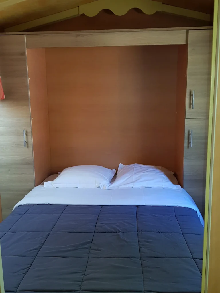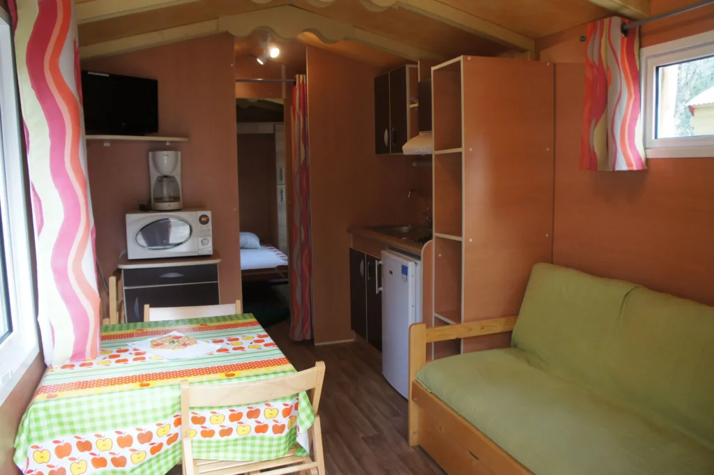 D’une superficie de 17m2, elles sont composées de pièces successives : un espace salon avec une banquette convertible et téléviseur, un coin cuisine aménagé, une salle d’eau avec toilettes séparées, et pour finir une chambre avec un grand lit.